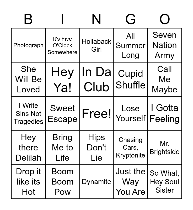 This bingo card has a free space and 29 words: Drop it like its Hot, SexyBack, Sweet Escape, Since U Been Gone, Photograph, Hollaback Girl, Hey Ya!, Bring Me to Life, Lose Yourself, Boom Boom Pow, I Gotta Feeling, So What, Hey Soul Sister, Dynamite, Just the Way You Are, Call Me Maybe, Hot in Herre, Hips Don't Lie, Hey there Delilah, Seven Nation Army, I Write Sins Not Tragedies, Chasing Cars, Kryptonite, Down with the Sickness, Cupid Shuffle, She Will Be Loved, All Summer Long, It's Five O'Clock Somewhere, Mr. Brightside, In Da Club and Bye Bye Bye..