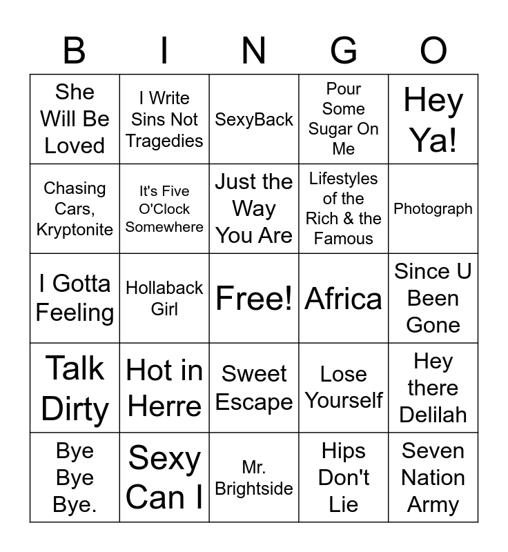 This bingo card has a free space and 42 words: Dynamite, Just the Way You Are, Call Me Maybe, Hot in Herre, Hips Don't Lie, Hey there Delilah, Seven Nation Army, Drop it like its Hot, SexyBack, Sweet Escape, Since U Been Gone, Photograph, Hollaback Girl, Hey Ya!, Bring Me to Life, Lose Yourself, Boom Boom Pow, I Gotta Feeling, So What, Hey Soul Sister, I Write Sins Not Tragedies, Chasing Cars, Kryptonite, Down with the Sickness, Cupid Shuffle, She Will Be Loved, All Summer Long, Ocean Avenue, Lifestyles of the Rich & the Famous, Black & Yellow, Drink In My Hand, Come On Eileen, Go Your Own Way, Talk Dirty, It's Five O'Clock Somewhere, Mr. Brightside, In Da Club, Bye Bye Bye., Sexy Can I, Africa, Spice up your life, Toxic, Pour Some Sugar On Me and Free Fallin'.