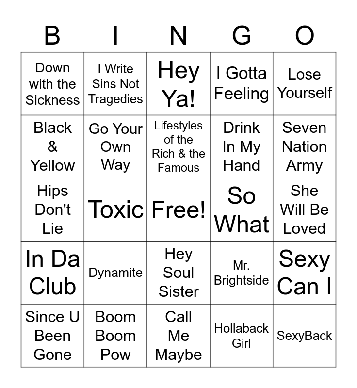 This bingo card has a free space and 44 words: Drop it like its Hot, SexyBack, Sweet Escape, Since U Been Gone, Photograph, Hollaback Girl, Hey Ya!, Bring Me to Life, Lose Yourself, Boom Boom Pow, I Gotta Feeling, So What, Hey Soul Sister, Dynamite, Just the Way You Are, Call Me Maybe, Hot in Herre, Hips Don't Lie, Hey there Delilah, Seven Nation Army, I Write Sins Not Tragedies, Chasing Cars, Kryptonite, Down with the Sickness, Cupid Shuffle, She Will Be Loved, All Summer Long, It's Five O'Clock Somewhere, Mr. Brightside, In Da Club, Bye Bye Bye., Sexy Can I, Africa, Spice up your life, Toxic, Pour Some Sugar On Me, Free Fallin', Ocean Avenue, Lifestyles of the Rich & the Famous, Black & Yellow, Drink In My Hand, Come On Eileen, Go Your Own Way and Talk Dirty.
