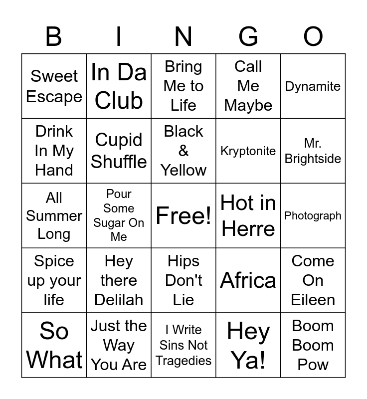 This bingo card has a free space and 44 words: Lose Yourself, Boom Boom Pow, I Gotta Feeling, So What, Hollaback Girl, Hey Ya!, Bring Me to Life, Hey Soul Sister, Dynamite, Just the Way You Are, Call Me Maybe, Hot in Herre, Hips Don't Lie, Hey there Delilah, Seven Nation Army, I Write Sins Not Tragedies, Chasing Cars, All Summer Long, It's Five O'Clock Somewhere, Mr. Brightside, In Da Club, Drop it like its Hot, SexyBack, Sweet Escape, Since U Been Gone, Photograph, Bye Bye Bye., Sexy Can I, Africa, Spice up your life, Toxic, Come On Eileen, Go Your Own Way, Talk Dirty, Pour Some Sugar On Me, Free Fallin', Ocean Avenue, Lifestyles of the Rich & the Famous, Black & Yellow, Drink In My Hand, Kryptonite, Down with the Sickness, Cupid Shuffle and She Will Be Loved.