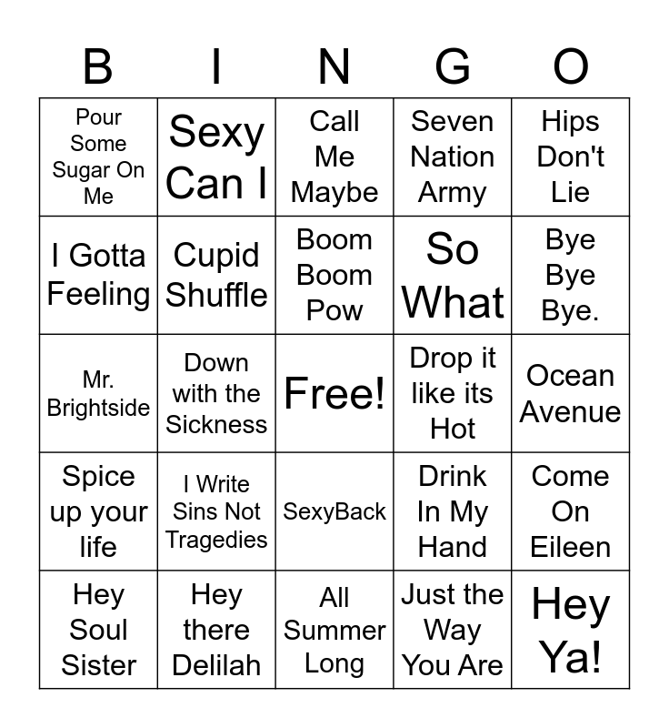 This bingo card has a free space and 44 words: Hollaback Girl, Hey Ya!, Bring Me to Life, Hey Soul Sister, Dynamite, Just the Way You Are, Call Me Maybe, Hot in Herre, Hips Don't Lie, Hey there Delilah, Seven Nation Army, Drop it like its Hot, SexyBack, I Write Sins Not Tragedies, Chasing Cars, All Summer Long, It's Five O'Clock Somewhere, Mr. Brightside, In Da Club, Bye Bye Bye., Sexy Can I, Africa, Talk Dirty, Pour Some Sugar On Me, Free Fallin', Ocean Avenue, Lifestyles of the Rich & the Famous, Black & Yellow, Drink In My Hand, Spice up your life, Toxic, Come On Eileen, Go Your Own Way, Kryptonite, Down with the Sickness, Sweet Escape, Since U Been Gone, Lose Yourself, Boom Boom Pow, I Gotta Feeling, So What, Photograph, Cupid Shuffle and She Will Be Loved.