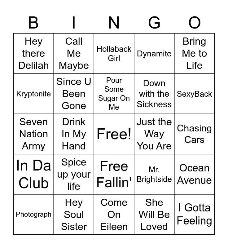 This bingo card has a free space and 44 words: Boom Boom Pow, I Gotta Feeling, So What, Photograph, Cupid Shuffle, She Will Be Loved, Hollaback Girl, Hey Ya!, Bring Me to Life, Hey Soul Sister, Dynamite, Just the Way You Are, Free Fallin', Spice up your life, Toxic, Come On Eileen, Go Your Own Way, Seven Nation Army, Drop it like its Hot, SexyBack, Call Me Maybe, Hot in Herre, Hips Don't Lie, Hey there Delilah, I Write Sins Not Tragedies, Chasing Cars, All Summer Long, It's Five O'Clock Somewhere, Mr. Brightside, In Da Club, Bye Bye Bye., Ocean Avenue, Lifestyles of the Rich & the Famous, Black & Yellow, Drink In My Hand, Sexy Can I, Africa, Talk Dirty, Pour Some Sugar On Me, Kryptonite, Down with the Sickness, Sweet Escape, Since U Been Gone and Lose Yourself.