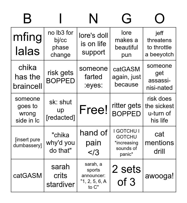 This bingo card has a free space and 24 words: catGASM, "chika why'd you do that", someone farted :eyes:, 2 sets of 3, jeff threatens to throttle a beeyotch, mfing lalas, no lb3 for bj/cc phase change, lore's doll is on life support, ritter gets BOPPED, risk does the sickest u-turn of his life, someone goes to wrong side in lc, risk gets BOPPED, I GOTCHU I GOTCHU *increasing sounds of panic*, cat mentions drill, chika has the braincell, sarah crits stardiver, sarah, a sports announcer: "1, 2, 5, 6, A to C", lore makes a beautiful pun, someone get assassi-nisi-nated, [insert pure dumbassery], sk: shut up [redacted], hand of pain </3, catGASM again, just because and awooga!.