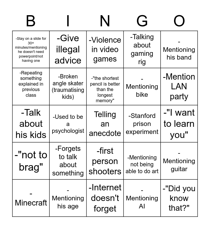 This bingo card has a free space and 24 words: -Forgets to talk about something, -Mentioning his age, -"the shortest pencil is better than the longest memory", -Minecraft, -Mentioning his band, -Stay on a slide for 30+ minutes/mentioning he doesn't need powerpoint/not having one, -Repeating something explained in previous class, -Give illegal advice, -Stanford prison experiment, -first person shooters, -Mentioning bike, -Talk about his kids, -Mentioning not being able to do art, -Mentioning guitar, -Broken angle skater (traumatising kids), -Mentioning AI, -"I want to learn you", -Violence in video games, -Mention LAN party, -Used to be a psychologist, -"Did you know that?", -"not to brag", -Talking about gaming rig and -Internet doesn't forget.