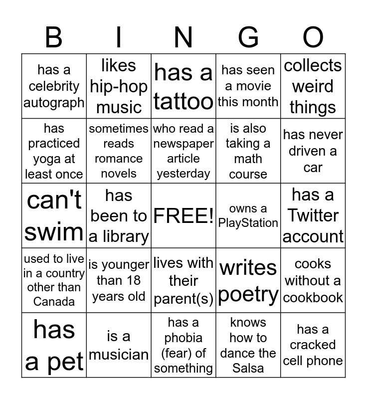 This bingo card has a free space and 24 words: is younger than 18 years old, is a musician, who read a newspaper article yesterday, has a pet, collects weird things, has a celebrity autograph, has practiced yoga at least once, likes hip-hop music, owns a PlayStation, lives with their parent(s), is also taking a math course, can't swim, writes poetry, cooks without a cookbook, sometimes reads romance novels, knows how to dance the Salsa, has a Twitter account, has a tattoo, has never driven a car, has been to a library, has a cracked cell phone, used to live in a country other than Canada, has seen a movie this month and has a phobia (fear) of something.