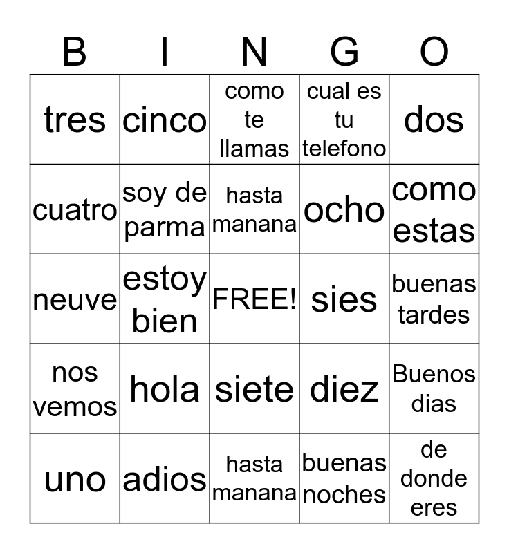 This bingo card has a free space and 24 words: hola, adios, hasta manana, uno, dos, tres, cuatro, cinco, sies, siete, ocho, neuve, diez, Buenos dias, soy de parma, buenas noches, buenas tardes, como te llamas, como estas, estoy bien, de donde eres, nos vemos, cual es tu telefono and hasta manana.
