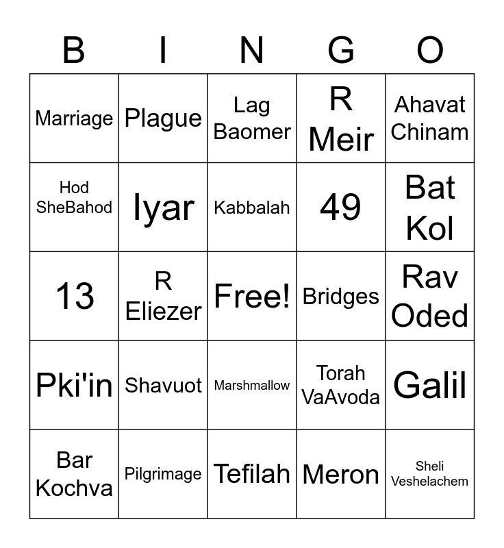 This bingo card has a free space and 74 words: Rashbi, 33, Lag Baomer, Sefirat Haomer, Bonfire, Carob, Cave, Zohar, Bar Kochva, Rabbi Akivah, 24,000, Rachel, Kabbalah, Hod SheBahod, Romans, R Eliezer, Eyes of Fire, Bat Kol, Stream, 13, Iyar, Plague, R Meir, Gemara, Sheli Veshelachem, Batata, Bow, Arrow, Torah, Tanaim, Ahavat Chinam, Sinat Chinam, Shelo Nahago Kavod Ze Baze, Rabbi Shimon Bar Yochai, Hilulah, Meron, Kever Rashbi, 45, Candles, Tehilim, Tefilah, Pilgrimage, Shaving, Music, Simcha, Marriage, 7 weeks, Shavuot, Chol Hamoed, Kalva Savuah, Golden Jerusalem, Shepard, Rav Oded, Should I Shave My Beard?, Kavod, Fire, Marshmallow, Smores, BBQ, Galil, 49, Chalake, Pki'in, R Yossi, Bridges, Tzipori, Eliyahu Hanavi, Sand, Torah VaAvoda, ואהבת לרעך כמוך, Titus, 14, 1953 and Israel.