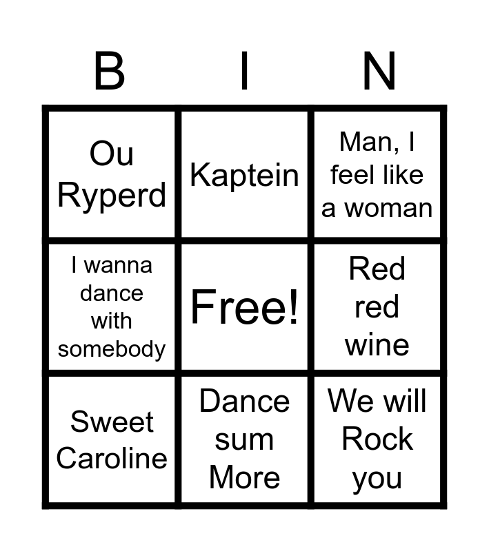 This bingo card has a free space and 14 words: Living on a prayer, Summer of '69, Sweet Caroline, Kaptein, I wanna dance with somebody, We will Rock you, Simply the Best, Forever young, Dance sum More, Ou Ryperd, Rooi rok bokkie, Red red wine, Man, I feel like a woman and Walking in Memphis.