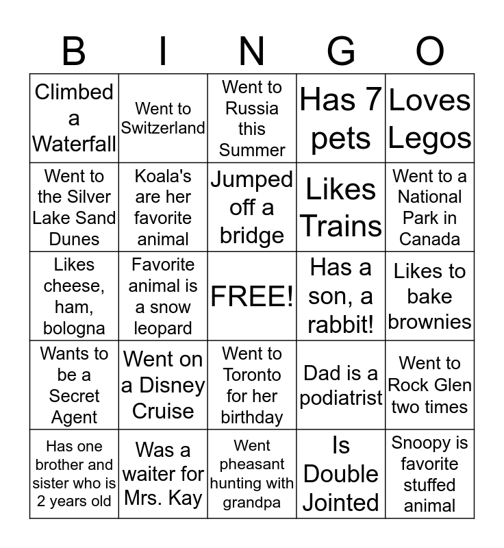 This bingo card has a free space and 24 words: Went on a Disney Cruise, Was a waiter for Mrs. Kay, Jumped off a bridge, Has one brother and sister who is 2 years old, Loves Legos, Climbed a Waterfall, Went to the Silver Lake Sand Dunes, Went to Switzerland, Has a son, a rabbit!, Went to Toronto for her birthday, Likes Trains, Likes cheese, ham, bologna, Dad is a podiatrist, Went to Rock Glen two times, Koala's are her favorite animal, Is Double Jointed, Likes to bake brownies, Went to Russia this Summer, Went to a National Park in Canada, Favorite animal is a snow leopard, Snoopy is favorite stuffed animal, Wants to be a Secret Agent, Has 7 pets and Went pheasant hunting with grandpa.