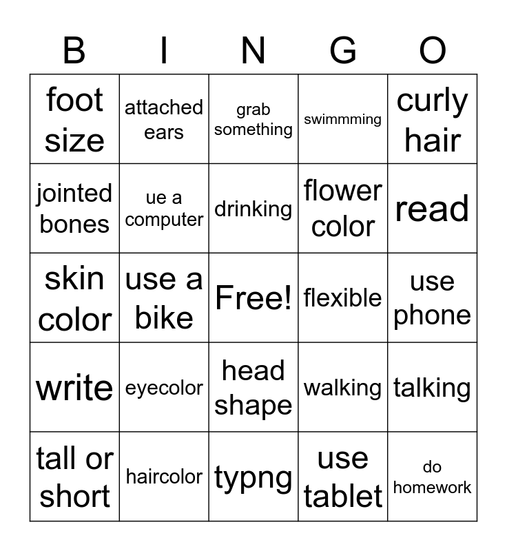 This bingo card has a free space and 24 words: eyecolor, haircolor, drinking, tall or short, curly hair, foot size, jointed bones, attached ears, flexible, head shape, flower color, skin color, walking, talking, ue a computer, use tablet, use phone, grab something, read, use a bike, do homework, write, swimmming and typng.