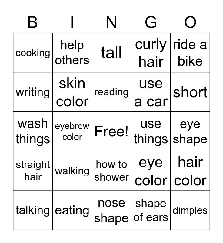 This bingo card has a free space and 24 words: walking, eating, reading, talking, ride a bike, cooking, writing, help others, use things, how to shower, use a car, wash things, eye color, hair color, skin color, shape of ears, eye shape, tall, short, eyebrow color, dimples, straight hair, curly hair and nose shape.