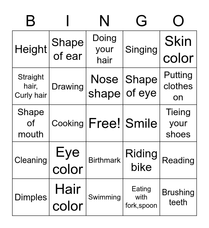 This bingo card has a free space and 24 words: Eye color, Hair color, Nose shape, Dimples, Skin color, Height, Straight hair, Curly hair, Shape of ear, Smile, Birthmark, Shape of eye, Shape of mouth, Riding bike, Reading, Drawing, Eating with fork,spoon, Tieing your shoes, Doing your hair, Putting clothes on, Cooking, Brushing teeth, Cleaning, Singing and Swimming.