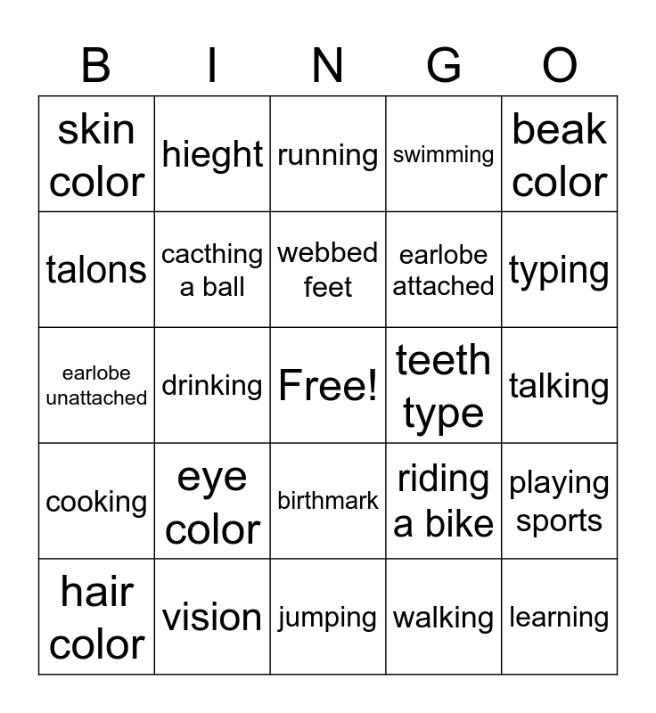 This bingo card has a free space and 24 words: eye color, vision, webbed feet, hair color, beak color, skin color, talons, hieght, teeth type, birthmark, earlobe attached, earlobe unattached, riding a bike, playing sports, cacthing a ball, walking, talking, running, typing, drinking, learning, cooking, swimming and jumping.