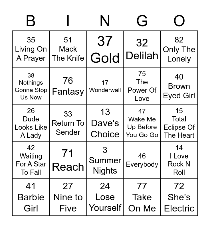 This bingo card has a free space and 89 words: 1 Billie Jean, 2 Mr Blue Sky, 3 Summer Nights, 4 Sweet Caroline, 5 Dancing Queen, 6 I Wanna Dance With Somebody, 7 Don't Stop Me Now, 8 Wannabe, 9 Torn, 10 Hey Jude, 11 Hit Me Baby One More Time, 12 Love Shack, 14 I Love Rock N Roll, 15 Total Eclipse Of The Heart, 16 Angels, 17 Wonderwall, 18 I need You Tonight, 19 Never Gonna Give You Up, 20 Ice Ice Baby, 21 Teenage Dirtbag, 22 Don't You Want Me, 23 Don’t You Forget About Me, 24 Lose Yourself, 25 Beautiful, 26 Dude Looks Like A Lady, 27 Nine to Five, 28 Uptown Funk, 29 Shake It Off, 30 Final Countdown, 31 Bohemian Rhapsody, 32 Delilah, 33 Return To Sender, 34 American Pie, 35 Living On A Prayer, 36 Summer Of 69, 37 Gold, 38 Nothings Gonna Stop Us Now, 39 Sweet Child Of Mine, 40 Brown Eyed Girl, 41 Barbie Girl, 42 Waiting For A Star To Fall, 43 Heartbreak Hotel, 44 Addicted To Love, 45 Man I Feel Like A Woman, 46 Everybody, 47 Wake Me Up Before You Go Go, 48 If I Could Turn Back Time, 49 Band Of Gold, 50 Like A Virgin, 51 Mack The Knife, 52 It's Not Unusual, 53 One Moment In Time, 54 Whiskey In The Jar, 55 One Way Or Another, 56 Gangnam Style, 57 Time Of My Life, 58 I Want It That Way, 59 It's Raining Men, 60 A Little Respect, 61 Sit Down, 62 My Sharona, 63 Islands In The Stream, 64 Chain Reaction, 65 Stacey’s Mom, 66 Love Really Hurts Without You, 67 My First, My Last, My Everything, 68 A Town Called Mallice, 69 Fairytale Of New York, 70 The Best, 71 Reach, 72 She’s Electric, 73 Sweet Dreams, 74 Africa, 75 The Power Of Love, 76 Fantasy, 77 Take On Me, 78 Dancing In The Moonlight, 79 Kung Fu Fighting, 80 Bad Touch, 81 Pretty Woman, 82 Only The Lonely, 83 Tubthumping, 84 Eye Of The Tiger, 85 Boom, Boom, Boom, Boom!!, 86 We're Going to Ibiza, 87 Because I Got High, 88 Jolene, 89 I Want To Break Free and 90 December 63.