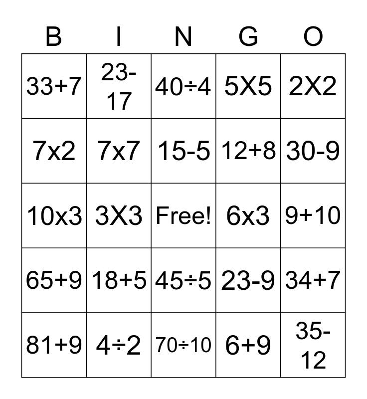 This bingo card has a free space and 24 words: 18+5, 4÷2, 15-5, 81+9, 2X2, 33+7, 7x2, 23-17, 6x3, 45÷5, 12+8, 10x3, 23-9, 34+7, 7x7, 6+9, 9+10, 40÷4, 30-9, 3X3, 35-12, 65+9, 5X5 and 70÷10.
