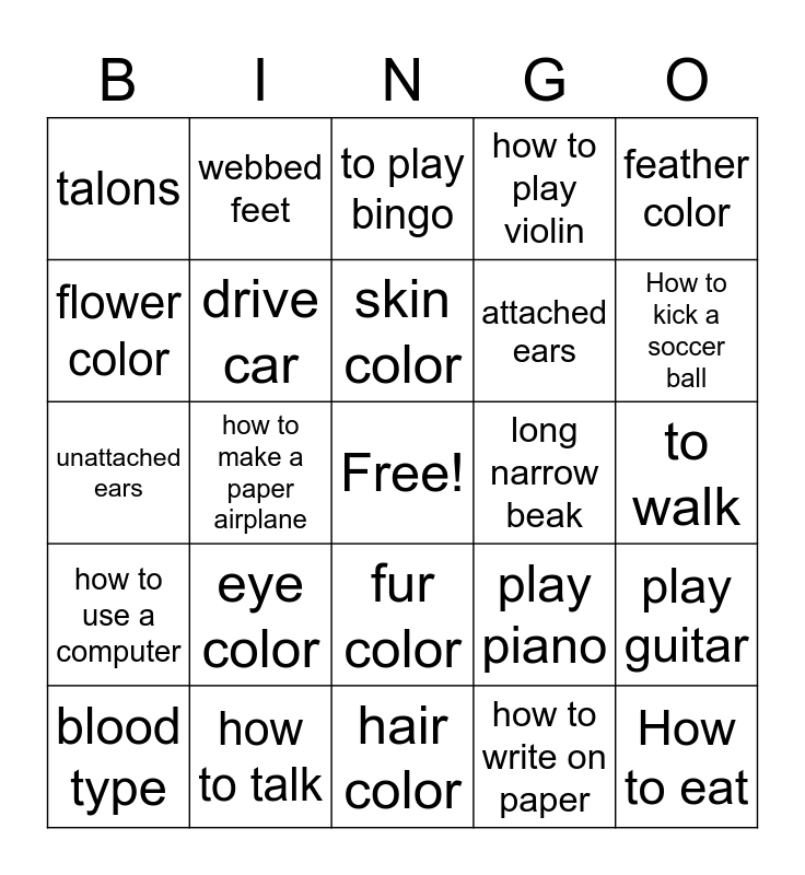 This bingo card has a free space and 25 words: eye color, hair color, skin color, blood type, feather color, talons, flower color, webbed feet, long narrow beak, fur color, attached ears, unattached ears, play piano, play guitar, drive car, to eat, to walk, to play bingo, How to kick a soccer ball, how to make a paper airplane, How to eat, how to talk, how to use a computer, how to play violin and how to write on paper.