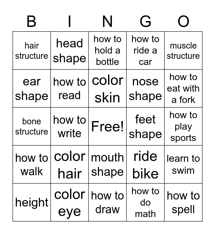 This bingo card has a free space and 24 words: color hair, color eye, color skin, height, muscle structure, hair structure, ear shape, head shape, feet shape, mouth shape, nose shape, bone structure, ride bike, learn to swim, how to read, how to do math, how to play sports, how to hold a bottle, how to eat with a fork, how to write, how to spell, how to walk, how to ride a car and how to draw.