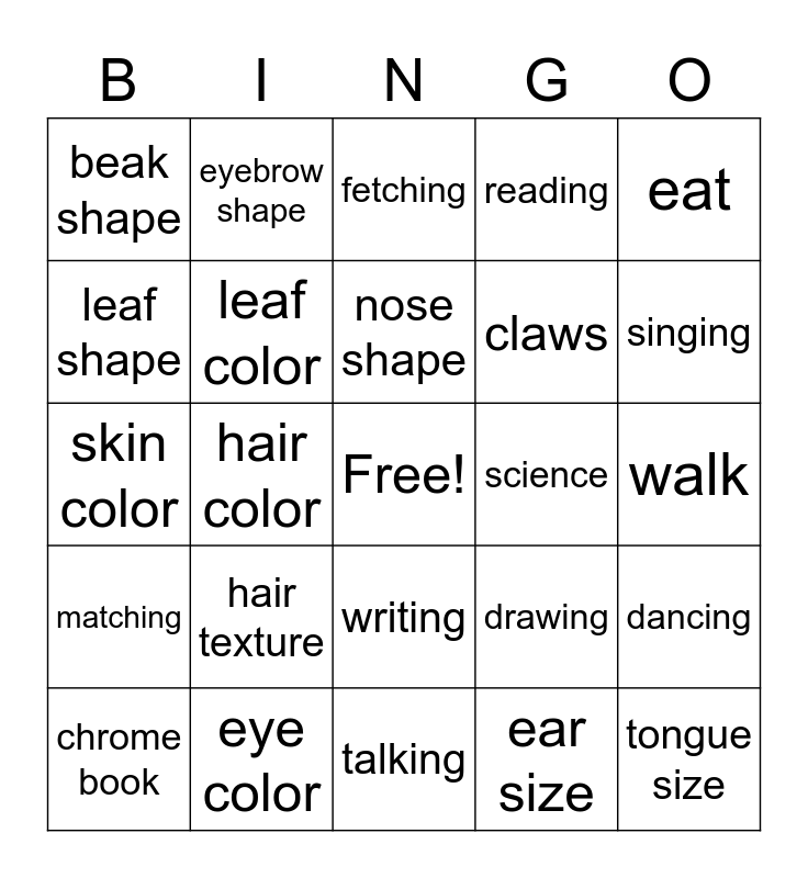 This bingo card has a free space and 24 words: hair texture, eye color, nose shape, chrome book, eat, beak shape, leaf shape, eyebrow shape, science, writing, claws, skin color, drawing, dancing, leaf color, ear size, walk, fetching, singing, hair color, tongue size, matching, reading and talking.
