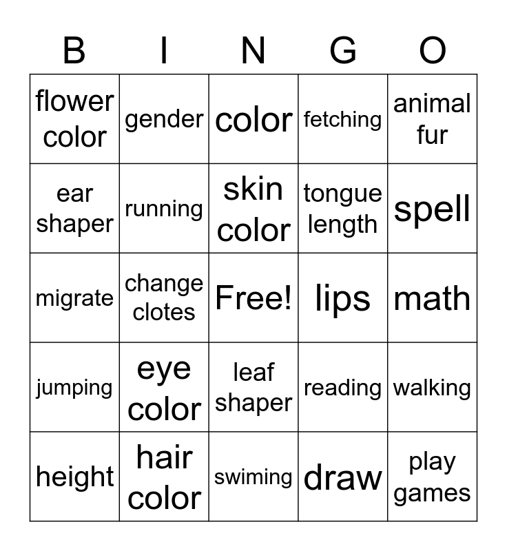 This bingo card has a free space and 24 words: eye color, hair color, skin color, height, animal fur, flower color, ear shaper, gender, lips, leaf shaper, tongue length, migrate, reading, walking, running, draw, math, color, spell, change clotes, play games, jumping, fetching and swiming.