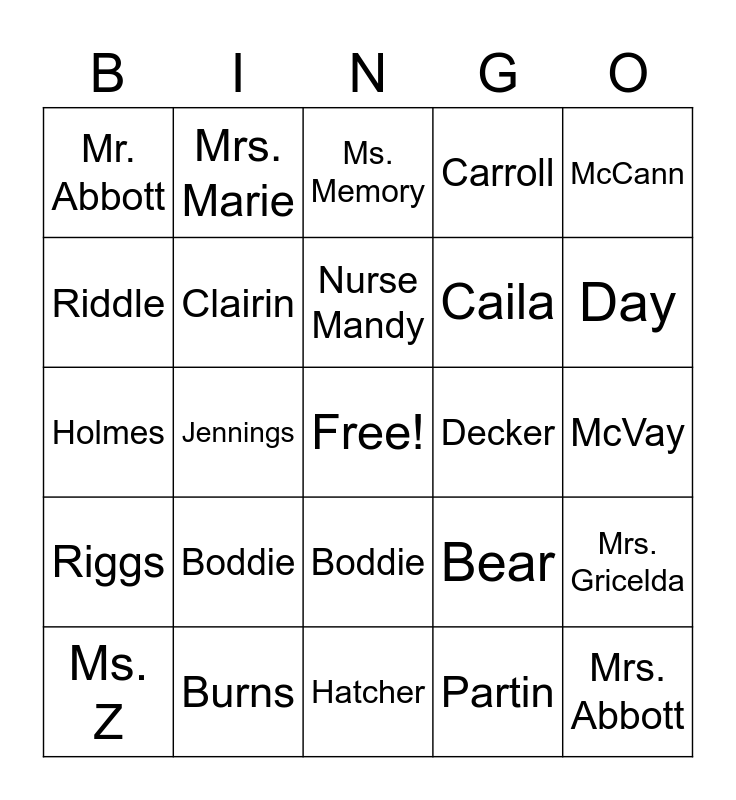 This bingo card has a free space and 29 words: Ms. Z, Lowe, Jennings, Sims, Mr. Abbott, Ms. Memory, Clairin, Boddie, Decker, Burns, McVay, Mrs. Abbott, Hatcher, Partin, Day, Mrs. Hahn, Boddie, Riggs, McCann, Holmes, Bear, Barker, Caila, Riddle, Carroll, Mrs. Marie, Mrs. Gricelda, Nurse Mandy and Mrs. Young.