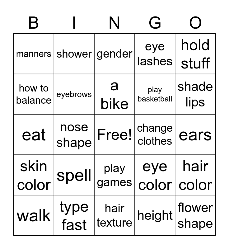 This bingo card has a free space and 24 words: spell, type fast, a bike, walk, hold stuff, manners, how to balance, shower, change clothes, play games, play basketball, eat, eye color, hair color, eyebrows, height, ears, gender, shade lips, nose shape, flower shape, skin color, eye lashes and hair texture.