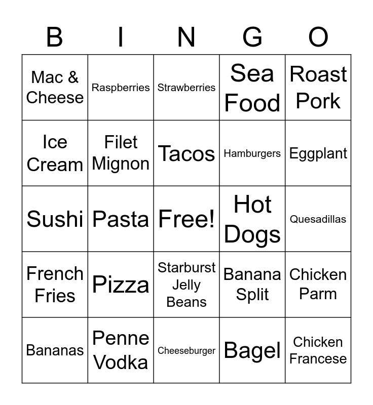 This bingo card has a free space and 24 words: Pizza, Penne Vodka, Tacos, Bananas, Roast Pork, Mac & Cheese, Ice Cream, Raspberries, Hot Dogs, Starburst Jelly Beans, Hamburgers, Sushi, Banana Split, Chicken Parm, Filet Mignon, Bagel, Quesadillas, Strawberries, Eggplant, Pasta, Chicken Francese, French Fries, Sea Food and Cheeseburger.
