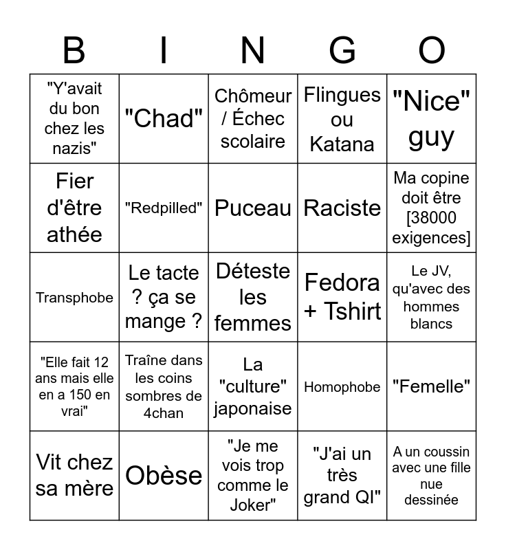 This bingo card has a free space and 24 words: Traîne dans les coins sombres de 4chan, Obèse, Puceau, Vit chez sa mère, "Nice" guy, "Y'avait du bon chez les nazis", Fier d'être athée, "Chad", Fedora + Tshirt, La "culture" japonaise, Raciste, Transphobe, Homophobe, "Femelle", "Redpilled", "J'ai un très grand QI", Le JV, qu'avec des hommes blancs, Chômeur / Échec scolaire, Ma copine doit être [38000 exigences], Le tacte ? ça se mange ?, A un coussin avec une fille nue dessinée, "Elle fait 12 ans mais elle en a 150 en vrai", Flingues ou Katana and "Je me vois trop comme le Joker".