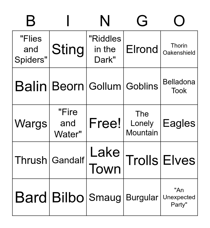 This bingo card has a free space and 24 words: Gandalf, Bilbo, Gollum, Bard, Thorin Oakenshield, "Flies and Spiders", Balin, Sting, The Lonely Mountain, Lake Town, Goblins, Wargs, Trolls, Elves, Beorn, Burgular, Eagles, "Riddles in the Dark", Belladona Took, "Fire and Water", "An Unexpected Party", Thrush, Elrond and Smaug.