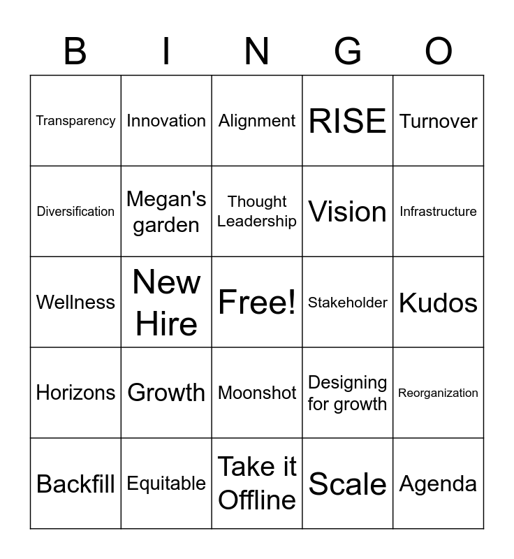 This bingo card has a free space and 47 words: Clarity, Agenda, Circle Back, Take it Offline, Growth, Slido, Innovation, Leverage, Diversification, Intentional, Megan's garden, RISE, Reorganization, Designing for growth, Collaborate, Workload, Thought Leadership, Stakeholder, Ecosystem, Turnover, New Hire, Scale, Transparency, Vision, Capacity Building, Infrastructure, Backfill, Impact Framework, Moonshot, Horizons, Change Management, Well being, Work-Life Balance, Focus Friday, Market Scan, Equitable, Kudos, Dance Competition, Strategy, Masterclass, Wizard, Alignment, Wellness, Lens, Framework, Transition and Onboarding.