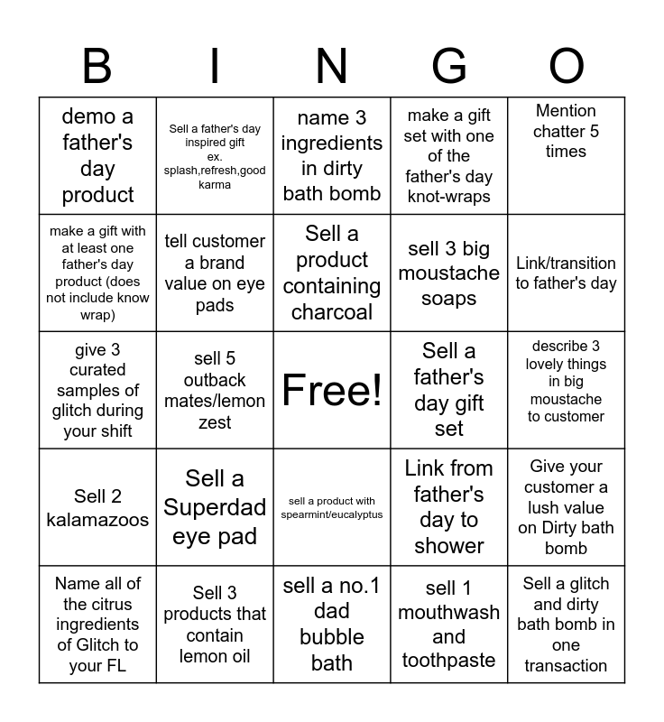 This bingo card has a free space and 24 words: Sell a Superdad eye pad, Sell 3 products that contain lemon oil, Sell a product containing charcoal, Name all of the citrus ingredients of Glitch to your FL, Mention chatter 5 times, demo a father's day product, make a gift with at least one father's day product (does not include know wrap), Sell a father's day inspired gift ex. splash,refresh,good karma, Sell a father's day gift set, sell a product with spearmint/eucalyptus, sell 3 big moustache soaps, give 3 curated samples of glitch during your shift, Link from father's day to shower, Give your customer a lush value on Dirty bath bomb, tell customer a brand value on eye pads, sell 1 mouthwash and toothpaste, describe 3 lovely things in big moustache to customer, name 3 ingredients in dirty bath bomb, Link/transition to father's day, sell 5 outback mates/lemon zest, Sell a glitch and dirty bath bomb in one transaction, Sell 2 kalamazoos, make a gift set with one of the father's day knot-wraps and sell a no.1 dad bubble bath.