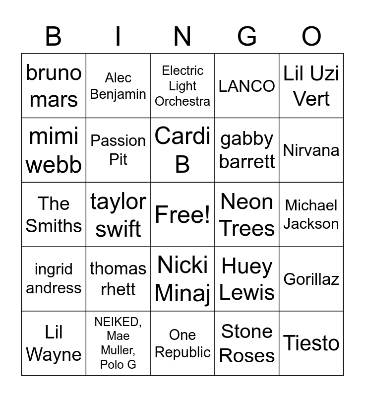 This bingo card has a free space and 66 words: Daniel Caesar, Adam Melchor, James Arthur, Gorillaz, Tame Impala, Olivia Rodrigo, Alec Benjamin, Jojo Siwa, Cardi B, Lana del Ray, Nicki Minaj, Frank Sinatra, Michael Jackson, Lil Uzi Vert, Kid Cudi, mimi webb, taylor swift, bruno mars, pitbull, gabby barrett, thomas rhett, ingrid andress, LANCO, sarah kinsley, of monsters and men, BORNS, the lumineers, EVAN GIIA, Tiesto, Fugees, Lil Wayne, Chris Stapleton, Steve Lacy, ELO (electric lights orchestra), Huey Lewis, NEIKED, Mae Muller, Polo G, gunna, The Smiths, Stone Roses, Empire of the Sun, Passion Pit, Silversun Pickups, Neon Trees, Yuck, Mac DeMarco, Alice In Chains, Nirvana, Joy Again, Modest Mouse, Hum, bella thorne and zendaya, Kanye West, Travis Scott, Chordettes, Huey Lewis and the News, Girl in Red, Leslie Odom Jr., Rolemodel, Electric Light Orchestra, One Republic, Any album is fine with me, 5 seconds of summer, Royal & The Serpent, NF, Straight No Chasers and Lin-Manuel Miranda.