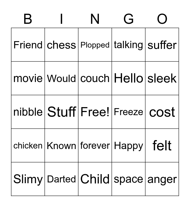 This bingo card has a free space and 29 words: Slimy, Bowl, Stuff, Sprint, Friend, Plopped, Would, Known, Freeze, Darted, cost, anger, Child, space, sleek, Motor, forever, chicken, suffer, nibble, Happy, Grapes, Hello, movie, talking, chess, felt, couch and apple.