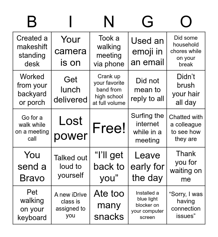 This bingo card has a free space and 80 words: Drank a glass of water, Joked about how long your “commute” is, Took a walking meeting via phone, “Can you hear me?”, Had a meeting interrupted by a pet or family member, Wore pajama bottoms to a video meeting, Spotted a pet in the background of a video meeting, Took a quick walk to stretch your legs, Took a coffee break… or three, Did eye strain relief exercises, “I think you are on mute”, “Can everyone see my screen?”, Used an emoji in an email, Created a makeshift standing desk, Did chair yoga, Worked from your backyard or porch, Created a workday playlist, Talked out loud to yourself, Replied with “LOL” and actually laughed, Chatted with a colleague to see how they are, Forgot to brush your teeth this morning, Did some household chores while on your break, Go for a walk while on a meeting call, Crank up your favorite band from high school at full volume, Get lunch delivered, Customize a Teams meeting background, Forgot the attachment while sending an email, Eat virtual lunch with a coworker, Internet goes down, Someone comments on the weather, Didn’t brush your hair all day, Watched a news channel, Ate too many snacks, Forgot about a meeting, Pet walking on your keyboard, Surfing the internet while in a meeting, People talking at the same time, Power point malfunction, “Can everyone go on mute?”, “Sorry, I was having connection issues”, Sound of someone typing in the background of a meeting, Awkward silence in a meeting, Loud echo, “We are just waiting on …”, Turn your camera on, Your camera is on, BRB, I’m back, Someone is at my door, Sorry I’m late, Thank you for waiting on me, Lost power, Leave early for the day, Did laundry while working from home, Can you turn your volume up/down?”, Took a virtual hallway chat, Attended Let’s Stay Connected session, “In a meeting right now”, Status set to Do Not Disturb, “I’ll get back to you”, Did not mean to reply to all, Sent chat to wrong person, My battery is running low, Get a phone call during a meeting, Let the dogs out, Let the dogs back inside, You send a “follow up” email, Someone asks, “How was your weekend?”, You receive an “out of the office” reply, You get a Bravo!, You send a Bravo, A new iDrive class is assigned to you, Future of Work, Got to go to my next meeting, Bathroom break, Sent a gif to a coworker, Installed a blue light blocker on your computer screen, Set up “working hours” #worklifebalance, Tried the Pomodoro technique and Took a typing speed test… for fun.