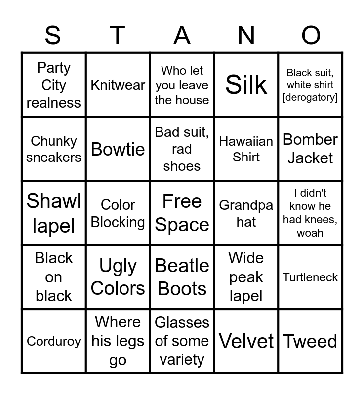 This bingo card has a free space and 24 words: Ugly Colors, Where his legs go, Bad suit, rad shoes, Corduroy, Black suit, white shirt [derogatory], Party City realness, Chunky sneakers, Knitwear, Grandpa hat, Beatle Boots, Hawaiian Shirt, Shawl lapel, Wide peak lapel, Turtleneck, Bowtie, Velvet, I didn't know he had knees, woah, Who let you leave the house, Bomber Jacket, Color Blocking, Tweed, Black on black, Silk and Glasses of some variety.