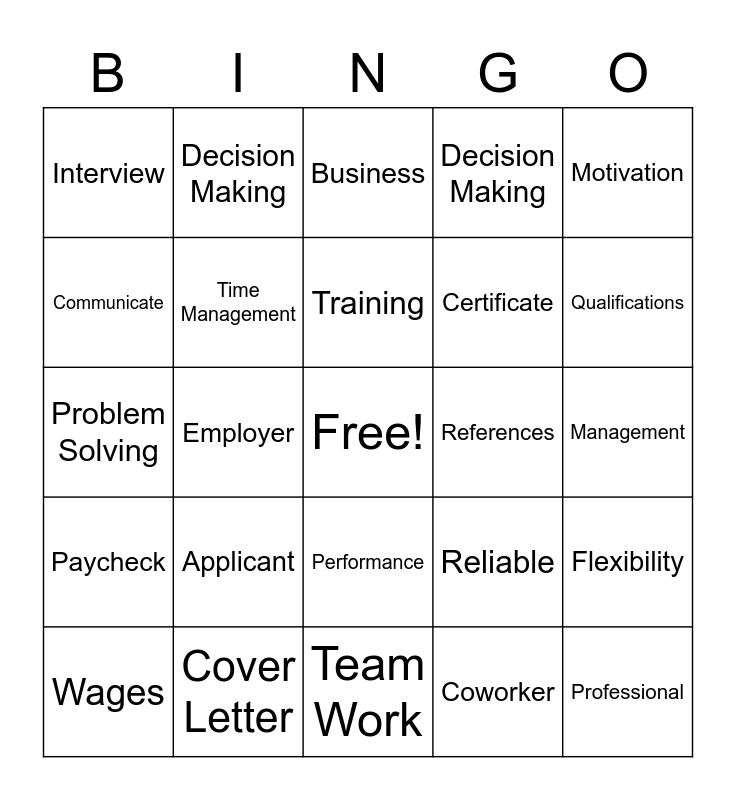 This bingo card has a free space and 24 words: Applicant, Cover Letter, Training, Wages, Motivation, Interview, Communicate, Decision Making, References, Performance, Certificate, Problem Solving, Reliable, Flexibility, Time Management, Coworker, Management, Business, Qualifications, Employer, Professional, Paycheck, Decision Making and Team Work.