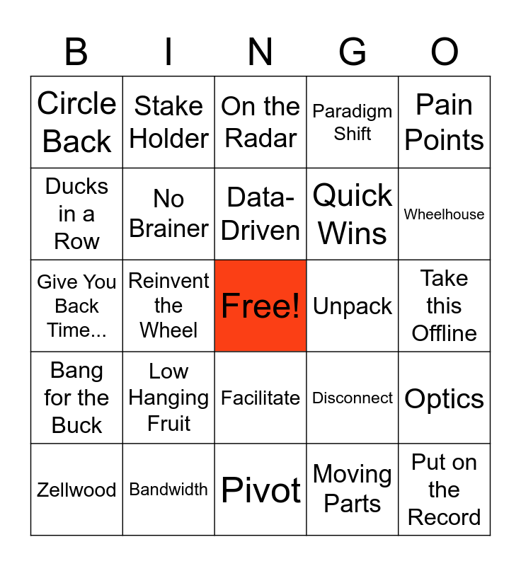 This bingo card has a free space and 29 words: Zellwood, Bird Dog, Reinvent the Wheel, At the End of the Day..., Circle Back, On the Radar, No Brainer, Low Hanging Fruit, Unpack, Bandwidth, Take this Offline, Put on the Record, Pivot, Moving Parts, Wheelhouse, Deep Dive, Facilitate, Bang for the Buck, Pain Points, Give You Back Time..., Disconnect, Leverage, Quick Wins, Ducks in a Row, Paradigm Shift, Stake Holder, Optics, Data-Driven and Move the Needle.