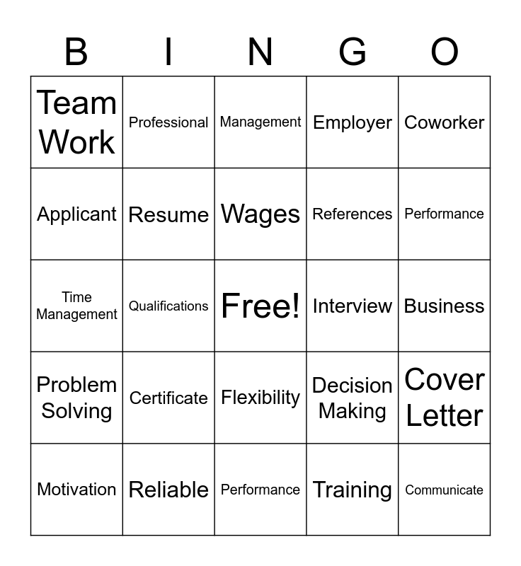 This bingo card has a free space and 24 words: Certificate, Reliable, Wages, Motivation, Coworker, Team Work, Applicant, Professional, Interview, Flexibility, References, Time Management, Decision Making, Cover Letter, Resume, Training, Business, Management, Performance, Qualifications, Communicate, Problem Solving, Employer and Performance.