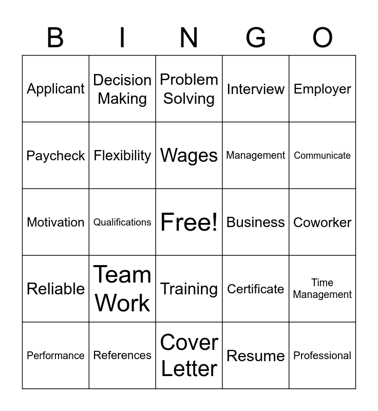 This bingo card has a free space and 24 words: Team Work, References, Wages, Performance, Employer, Applicant, Paycheck, Decision Making, Business, Training, Management, Motivation, Certificate, Time Management, Flexibility, Resume, Coworker, Problem Solving, Communicate, Qualifications, Professional, Reliable, Interview and Cover Letter.