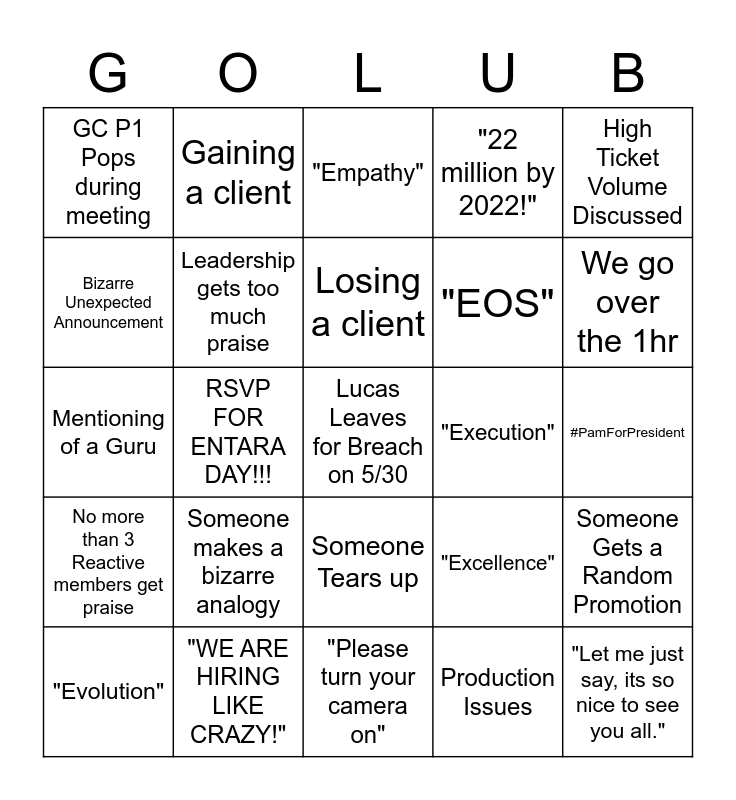 This bingo card has a free space and 24 words: Someone makes a bizarre analogy, "WE ARE HIRING LIKE CRAZY!", Losing a client, "Evolution", High Ticket Volume Discussed, GC P1 Pops during meeting, Bizarre Unexpected Announcement, Gaining a client, "Execution", Someone Tears up, "EOS", Mentioning of a Guru, "Excellence", Someone Gets a Random Promotion, Leadership gets too much praise, Production Issues, #PamForPresident, "Empathy", We go over the 1hr, RSVP FOR ENTARA DAY!!!, "Let me just say, its so nice to see you all.", No more than 3 Reactive members get praise, "22 million by 2022!" and "Please turn your camera on".
