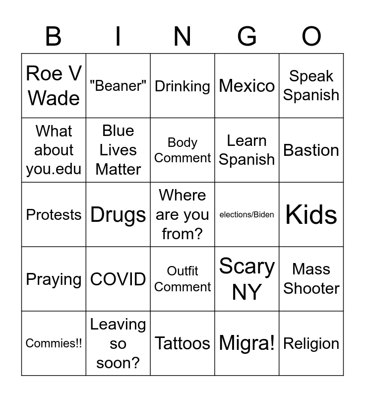 This bingo card has 25 words: COVID, Tattoos, Body Comment, Commies!!, Speak Spanish, Roe V Wade, What about you.edu, "Beaner", elections/Biden, Outfit Comment, Learn Spanish, Protests, Scary NY, Mass Shooter, Blue Lives Matter, Religion, Kids, Drinking, Bastion, Drugs, Where are you from?, Leaving so soon?, Praying, Mexico and Migra!.