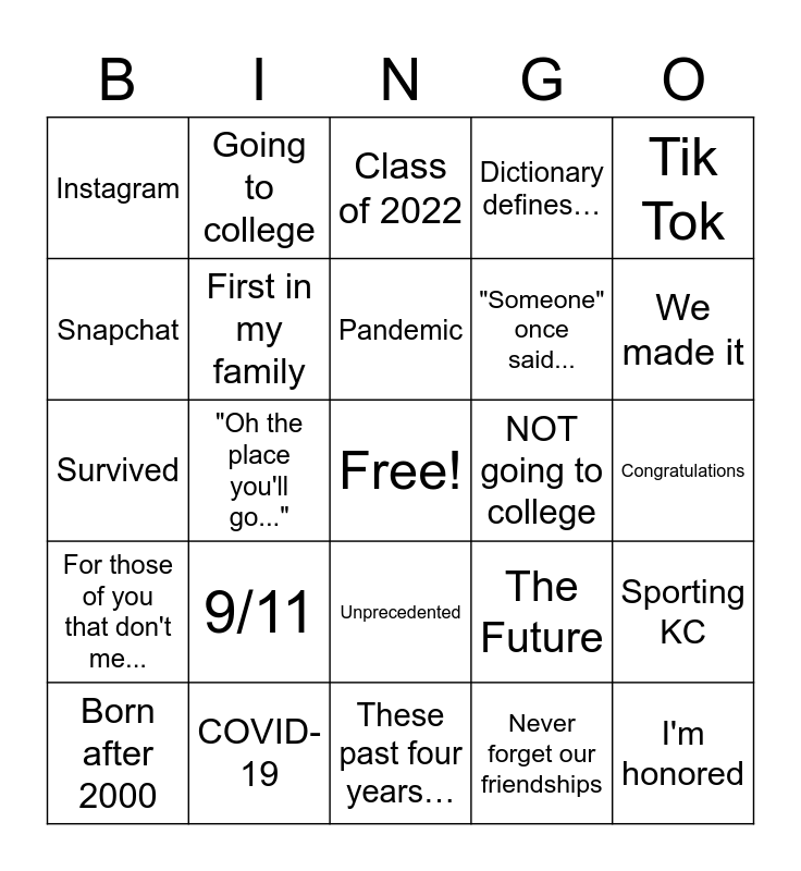 This bingo card has a free space and 24 words: 9/11, COVID-19, Pandemic, Born after 2000, Tik Tok, Instagram, Snapchat, Going to college, NOT going to college, Unprecedented, "Someone" once said..., Survived, The Future, Sporting KC, First in my family, Never forget our friendships, Congratulations, Class of 2022, We made it, "Oh the place you'll go...", I'm honored, For those of you that don't me..., Dictionary defines… and These past four years….
