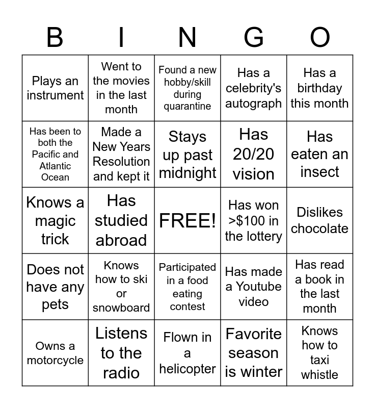 This bingo card has a free space and 24 words: Knows how to ski or snowboard, Listens to the radio, Stays up past midnight, Owns a motorcycle, Has a birthday this month, Plays an instrument, Has been to both the Pacific and Atlantic Ocean, Went to the movies in the last month, Has won >$100 in the lottery, Participated in a food eating contest, Has 20/20 vision, Knows a magic trick, Has made a Youtube video, Has read a book in the last month, Made a New Years Resolution and kept it, Favorite season is winter, Dislikes chocolate, Found a new hobby/skill during quarantine, Has eaten an insect, Has studied abroad, Knows how to taxi whistle, Does not have any pets, Has a celebrity's autograph and Flown in a helicopter.