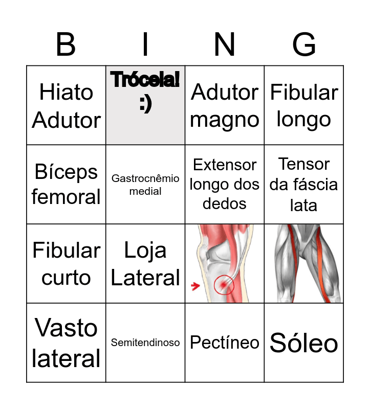 This bingo card has 4 images and 28 words: Glúteo médio, Tibial anterior, Isquiotibiais, Sóleo, Extensor longo dos dedos, Bíceps femoral, Quadríceps, Trócela! :), Tensor da fáscia lata, Adutor magno, Flexor longo dos dedos, Gastrocnêmio lateral, Semitendinoso, Piriforme, Adutor Longo, Grácil, Semimembranoso, Tibial posterior, Tríceps sural, Pectíneo, Reto femoral, Vasto lateral, Fibular longo, Fibular curto, Gastrocnêmio medial, Hiato Adutor, Tendão de Aquiles and Loja Lateral.