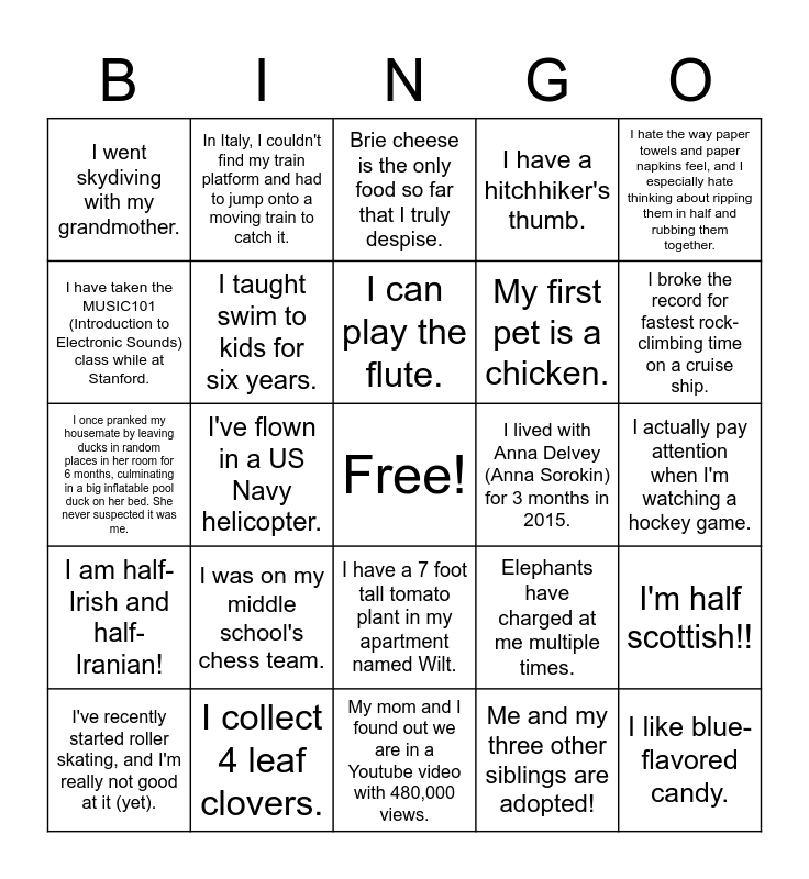 This bingo card has a free space and 24 words: I was on my middle school's chess team., I collect 4 leaf clovers., I can play the flute., I've recently started roller skating, and I'm really not good at it (yet)., I hate the way paper towels and paper napkins feel, and I especially hate thinking about ripping them in half and rubbing them together., I went skydiving with my grandmother., I have taken the MUSIC101 (Introduction to Electronic Sounds) class while at Stanford., In Italy, I couldn't find my train platform and had to jump onto a moving train to catch it., I lived with Anna Delvey (Anna Sorokin) for 3 months in 2015., I have a 7 foot tall tomato plant in my apartment named Wilt., My first pet is a chicken., I once pranked my housemate by leaving ducks in random places in her room for 6 months, culminating in a big inflatable pool duck on her bed. She never suspected it was me., Elephants have charged at me multiple times., I'm half scottish!!, I taught swim to kids for six years., Me and my three other siblings are adopted!, I actually pay attention when I'm watching a hockey game., Brie cheese is the only food so far that I truly despise., I broke the record for fastest rock-climbing time on a cruise ship., I've flown in a US Navy helicopter., I like blue-flavored candy., I am half-Irish and half-Iranian!, I have a hitchhiker's thumb. and My mom and I found out we are in a Youtube video with 480,000 views..