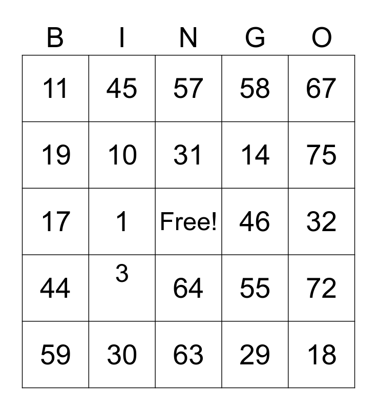 This bingo card has a free space and 24 words: 3, 30, 31, 59, 67, 11, 19, 45, 46, 64, 14, 17, 55, 72, 10, 29, 32, 57, 75, 1, 18, 44, 58 and 63.