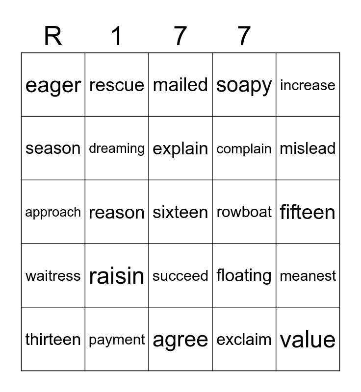 This bingo card has a free space and 24 words: raisin, payment, explain, thirteen, increase, eager, season, rescue, rowboat, succeed, complain, approach, floating, meanest, dreaming, exclaim, fifteen, mailed, mislead, reason, value, waitress, soapy and agree.