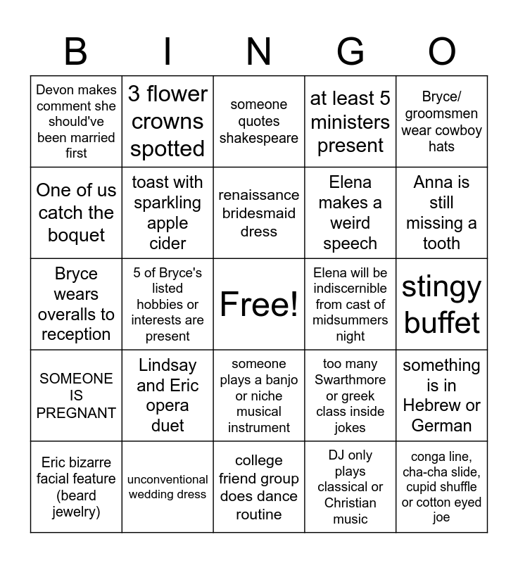 This bingo card has a free space and 24 words: Eric bizarre facial feature (beard jewelry), Lindsay and Eric opera duet, renaissance bridesmaid dress, DJ only plays classical or Christian music, Bryce/ groomsmen wear cowboy hats, Devon makes comment she should've been married first, 3 flower crowns spotted, someone quotes shakespeare, Elena will be indiscernible from cast of midsummers night, stingy buffet, Bryce wears overalls to reception, toast with sparkling apple cider, too many Swarthmore or greek class inside jokes, something is in Hebrew or German, One of us catch the boquet, unconventional wedding dress, college friend group does dance routine, at least 5 ministers present, Anna is still missing a tooth, SOMEONE IS PREGNANT, 5 of Bryce's listed hobbies or interests are present, someone plays a banjo or niche musical instrument, Elena makes a weird speech and conga line, cha-cha slide, cupid shuffle or cotton eyed joe.