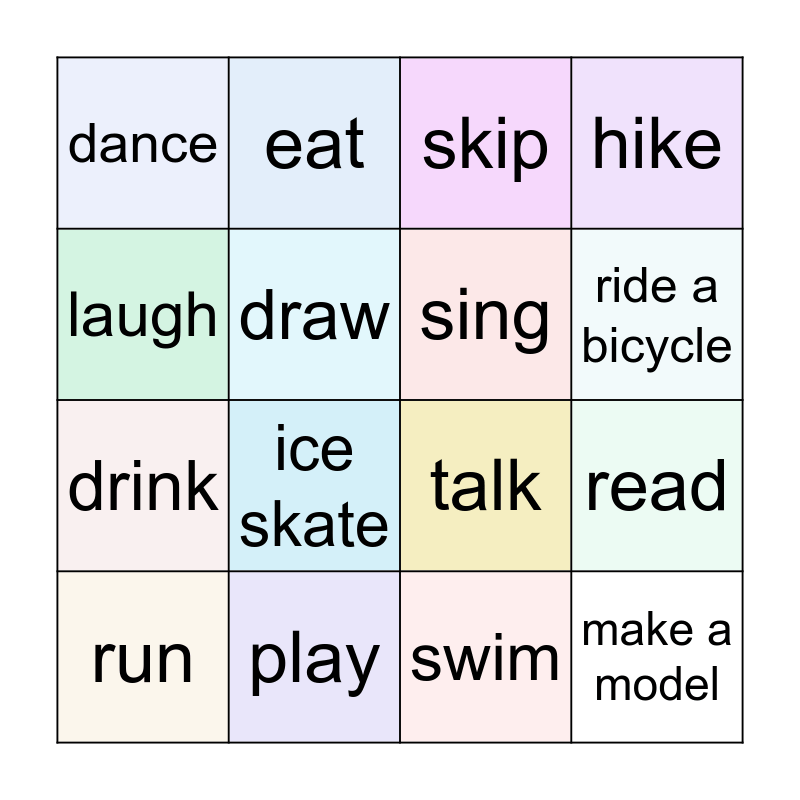 This bingo card has 17 words: swim, run, skip, dance, ice skate, hike, read, sing, ride a bicycle, draw, play, talk, laugh, eat, drink, sleep and make a model.