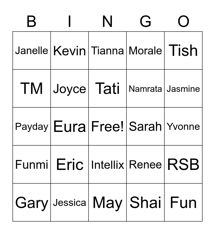 This bingo card has a free space and 24 words: Eric, Jessica, Tati, Gary, Tish, Janelle, TM, Kevin, Sarah, Intellix, Namrata, Payday, Renee, RSB, Joyce, Shai, Yvonne, Tianna, Jasmine, Eura, Fun, Funmi, Morale and May.
