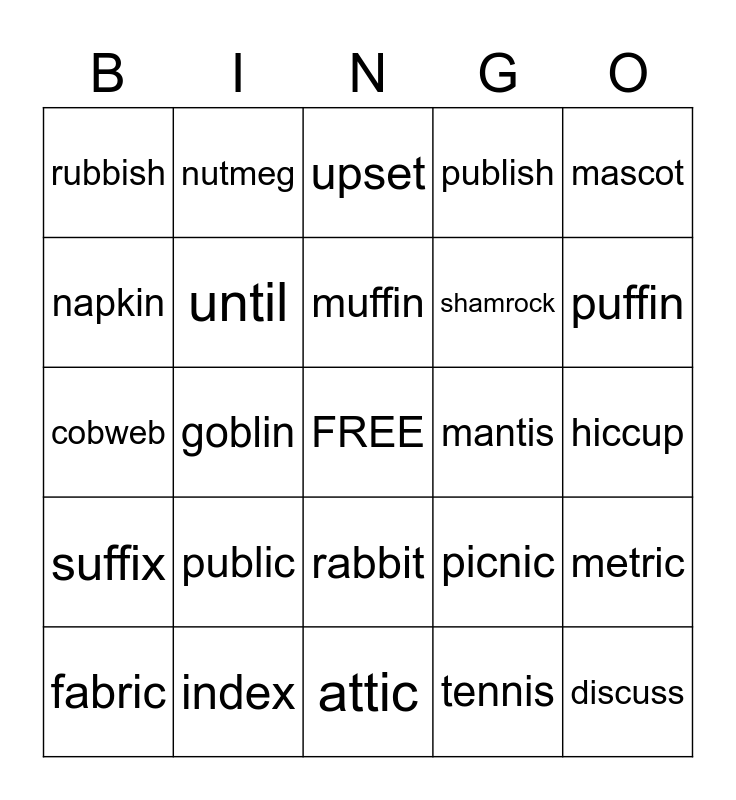 This bingo card has a free space and 24 words: public, index, muffin, fabric, mascot, rubbish, napkin, nutmeg, mantis, rabbit, shamrock, cobweb, picnic, metric, until, tennis, hiccup, upset, puffin, goblin, discuss, suffix, publish and attic.